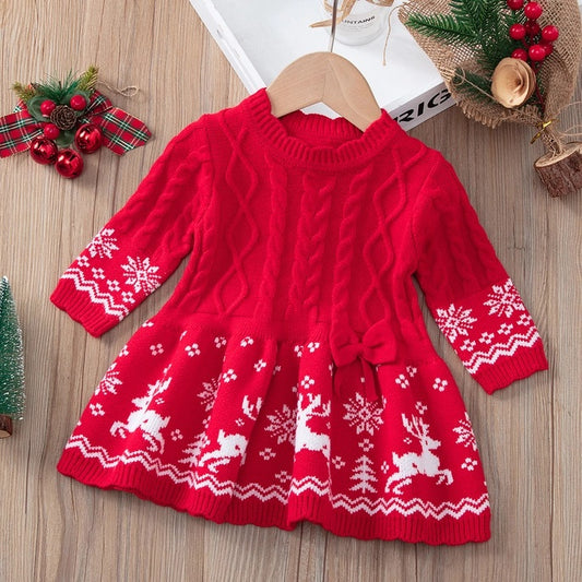 Christmas Reindeer Hoilday Sweater Dress For Baby Toddler
