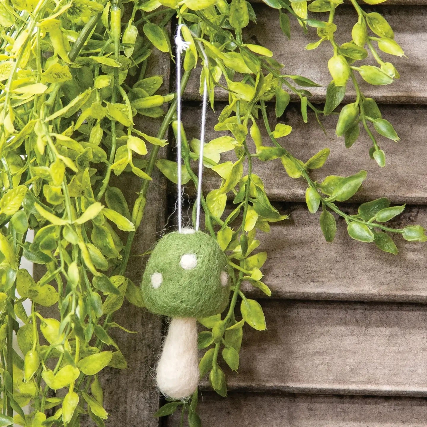 The Mushroom Ornament is a decorative mushroom figurine made of felt fabric with an ivory base, red or green top, and white polka dot design. The ornament includes a string hanger to use for display, bringing a fun and whimsical touch to the home during the Christmas season. Measures 2.5” high by 1.5” wide.