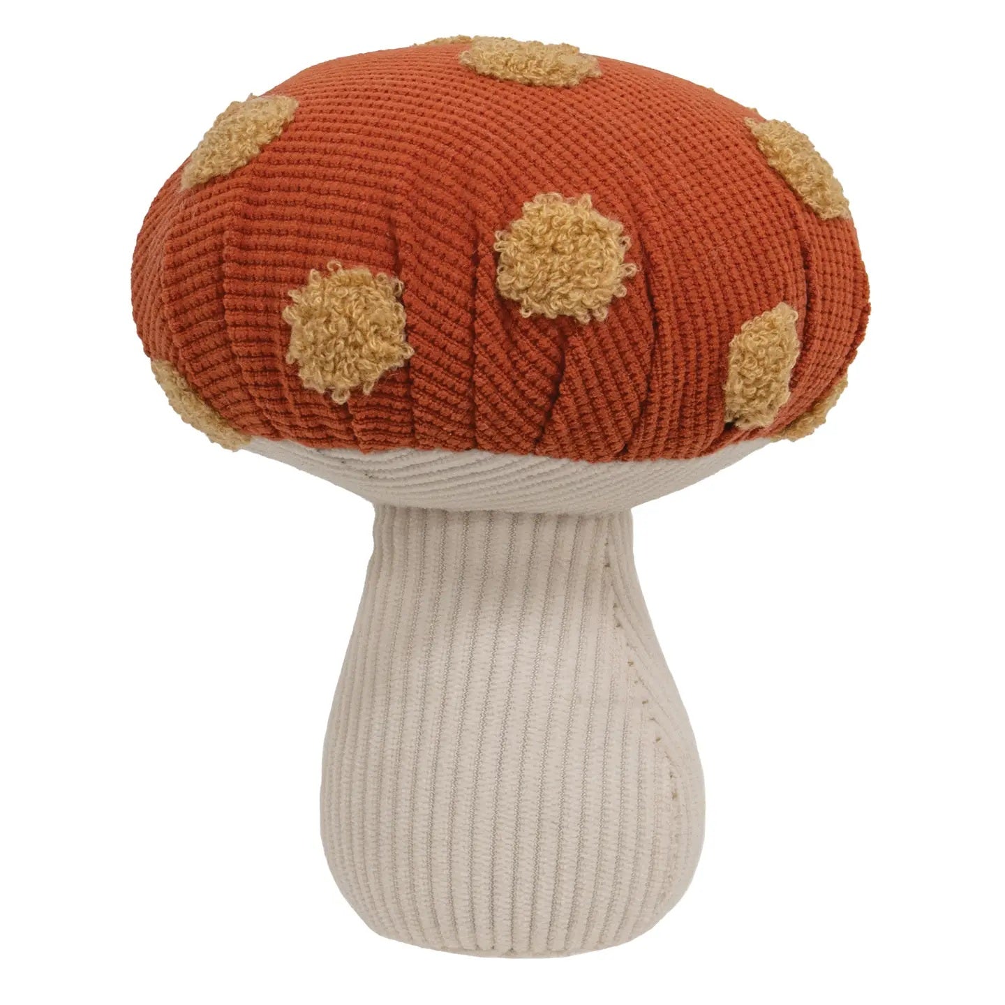 Add a pop of cozy charm to seasonal displays with this 6" Orange Polka Dot Mushroom Sitter. Made with soft ribbed fabric, it features a warm orange cap topped with fuzzy golden toned polka dots and a cream base. Measures 6" high.