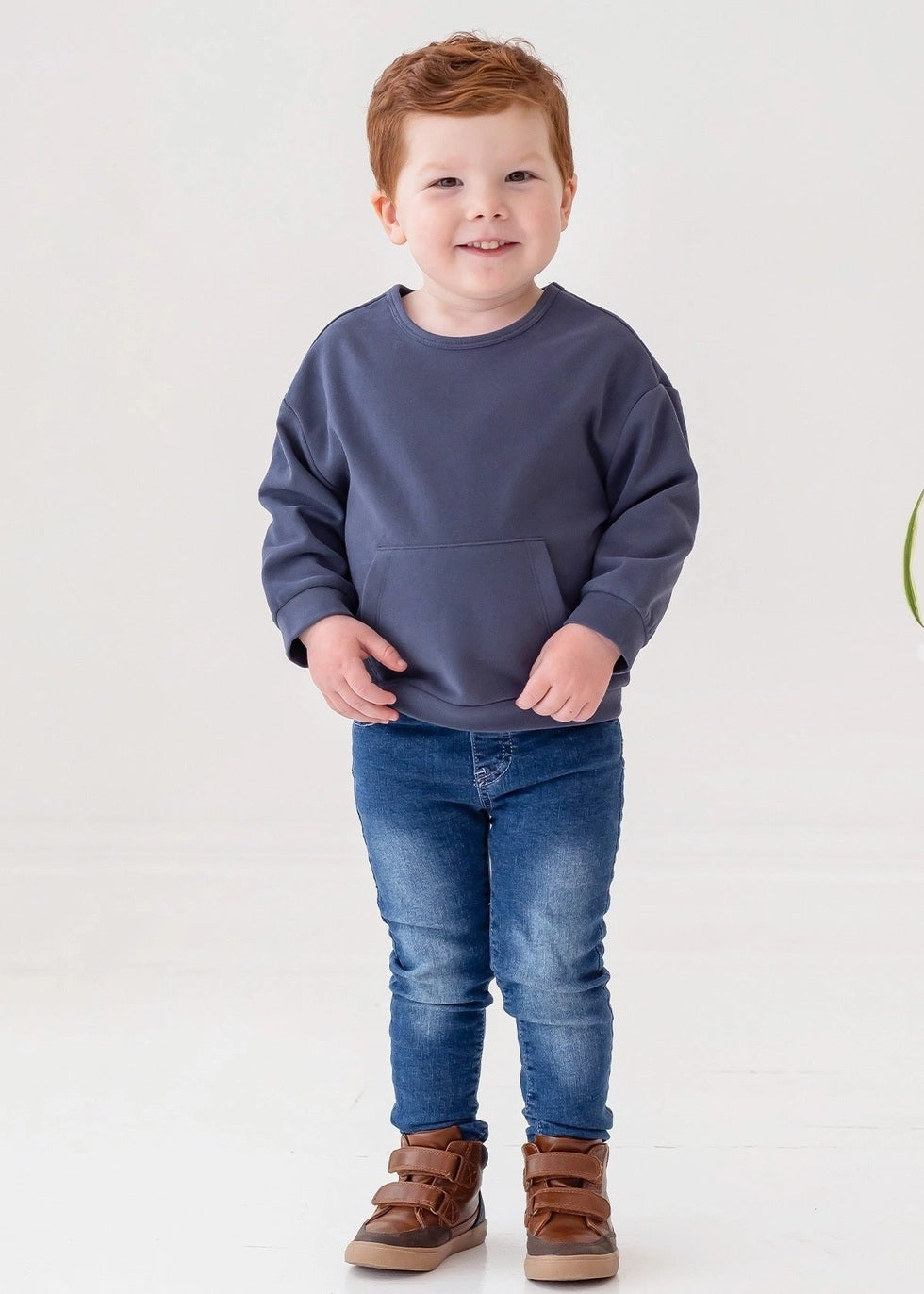 This boys' sweater comes in a rich navy color, offering a timeless and versatile addition to any wardrobe. The cozy pullover design features a front kangaroo pocket for added functionality and style. With its relaxed fit and ribbed cuffs, this sweater ensures both comfort and warmth, perfect for everyday wear.