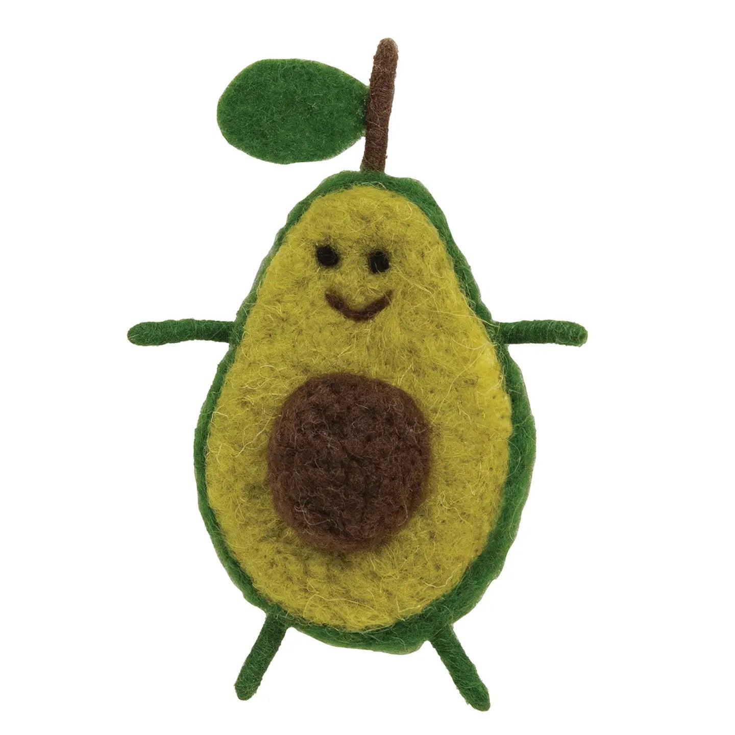 Add a slice of joy to your inventory with the Smiling Avocado Felted Ornament. This adorable, handcrafted ornament features a cheerful avocado complete with a fuzzy brown pit and a stitched-on smile that’s sure to brighten any space. A plastic loop is included for easy hanging. Pair him with our happy, veggie-inspired ornaments for a complete look. Measures 4.75" high by 2.5" wide.