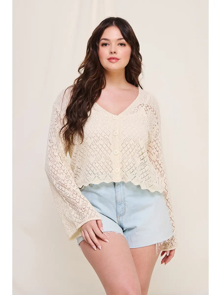 Long sleeve pointelle scallop hem fine gauge cardigan