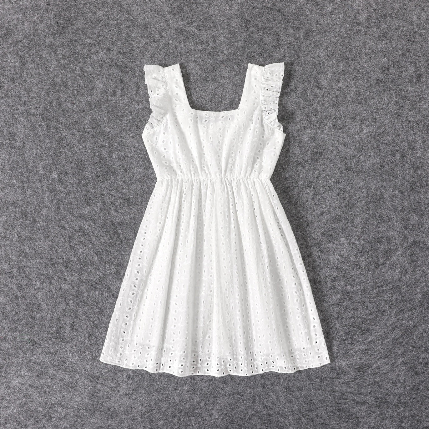 Versatile A-line shape, ruffle design & embroidered texture. Square-neck design & back bowknot decor(girls/babies). The dress length is above the knee of girls/babies.